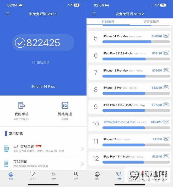 此外,我们还使用安兔兔综合跑分测试软件进行进一步的实测。综合得分为822425,与去年搭载同一款芯片的iPhone 13 Pro Max比较接近。这样看来,iPhone 14 Plus的性能还是足够大家日常使用的。