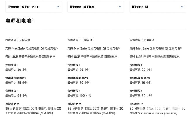 在无线充电方面,iPhone 14系列也与上一代iPhone 13系列保持一致。除了无缝支持磁吸MagSafe充电器外,配合20W充电头可实现最高15W快充,支持Qi标准的无线充电设备可实现最高15W快充。实现7.5W无线充电。