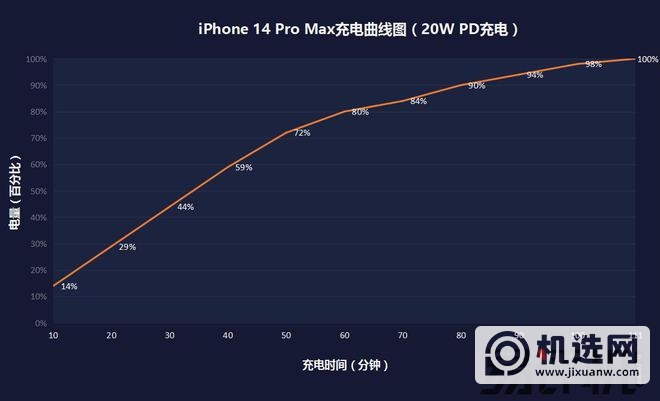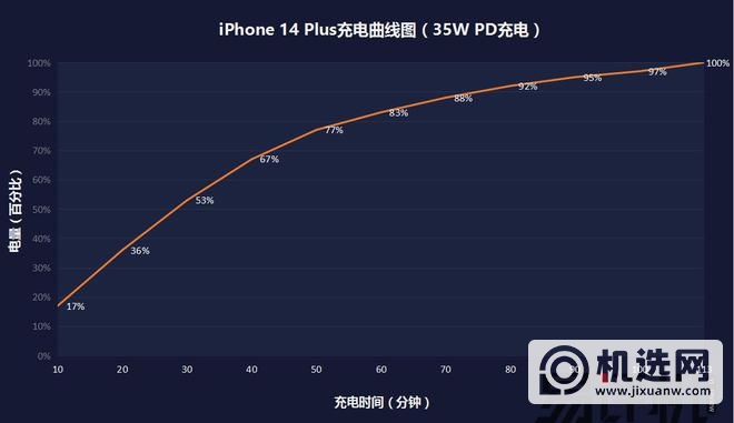 这次我们特意使用官方售价399元的新款35W双口USB-C充电器对iPhone 14 Plus进行0-100%充电测试。同时,与之前使用20W原装PD充电头给电池容量几乎相同的iPhone 14 Pro Max充电相比,具体结果如下两张图所示。