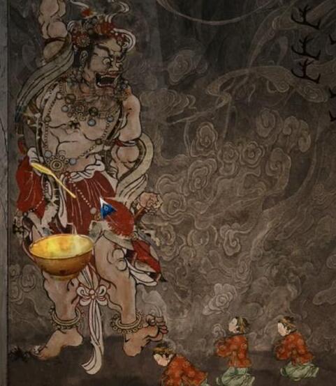8.用金粉给墙上的壁画上色。