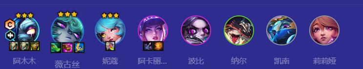 1.阵容组成:阿木木、维格斯、妮可、阿卡丽、波比、纳尔、凯南、莉莉娅