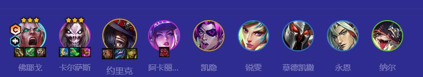 1.阵容组成:弗耶戈、死歌、约里克、阿卡丽、凯隐、瑞文、莫德凯撒、永恩、纳尔