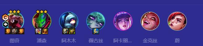 1.阵容组成:图奇、万神殿、阿木木、维格斯、阿卡丽、金克丝、威