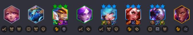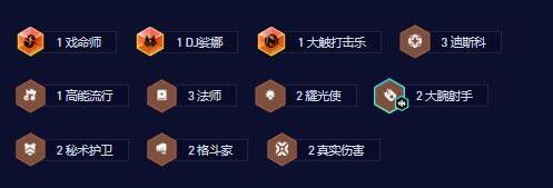 1名算命师、1名DJ娑娜、1名大打击乐手、3名迪斯科、1名高能流行音乐、3名法师、2名轻型使用者、2名大射手、2名秘密守卫、2名战士、2名真实伤害