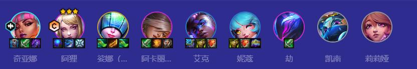 1.阵容组成:阿狸+奇亚娜+索娜+阿卡丽+艾克+妮可+劫+凯南+莉莉娅