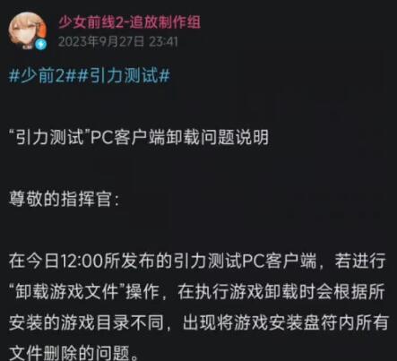 2、2023年9月27日少女前线2在内测删除测试时直接删除了大量玩家电脑数据,并直接清除。