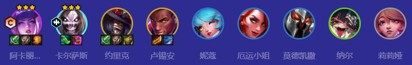 1.阵容组合:阿卡丽(KDA)+卡尔萨斯+约里克+卢锡安+妮蔻+厄运小姐+莫德凯撒+纳尔+莉莉娅
