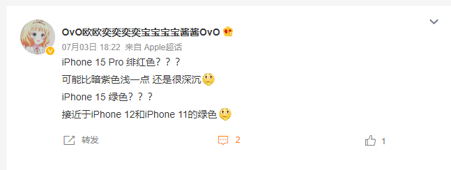 该媒体报道称,有关“绿松石色”iPhone 15和iPhone 15 Plus的消息来自微博用户,并未包含相关链接。