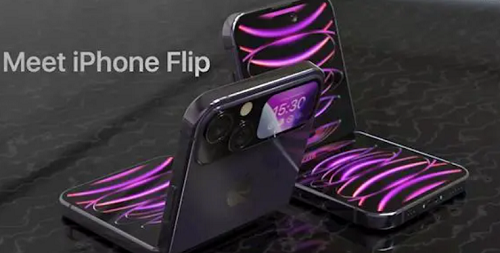 从产品效果图来看,这款产品的设计将采用翻盖式小型折叠工业设计。外面还会有一块副屏,可以用来显示一些时间、通知信息等。当然,这款机型的正面还是会有一个智能岛。