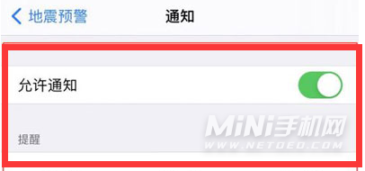4. 进入地震预警页面的通知选项,打开允许通知开关。设置完成后,当地震发生时,您的手机会收到预警提醒。