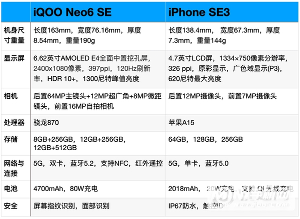 iQOO Neo6 SE与iPhone SE3主要参数对比图: