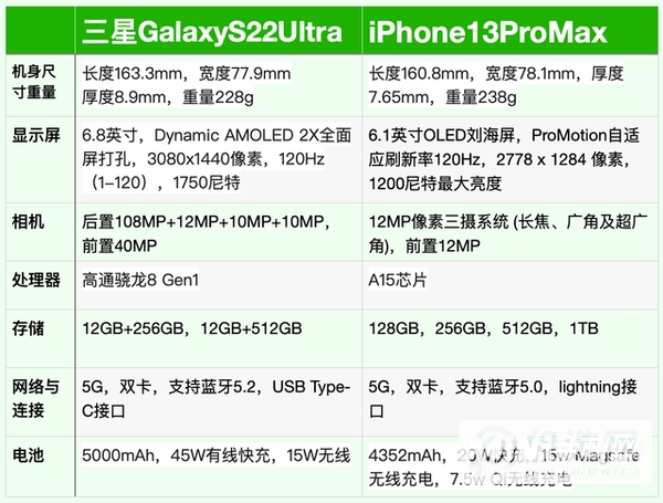 三星Galaxy S22 Ultra与iPhone 13 Pro Max主要配置参数对比图如下: