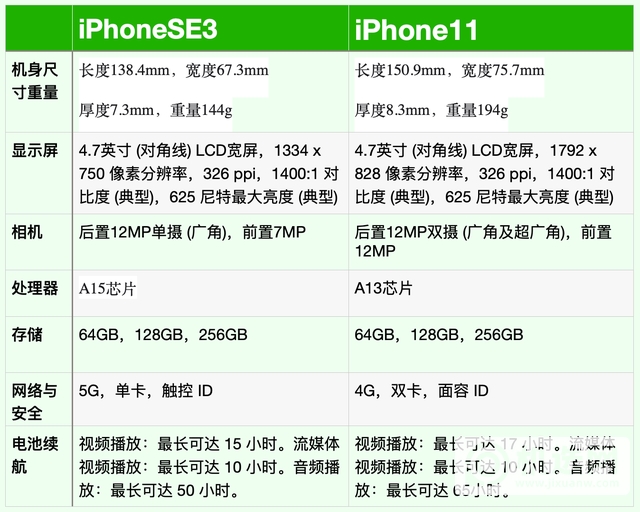 iPhone SE 3和iPhone 11主要配置参数对比图: