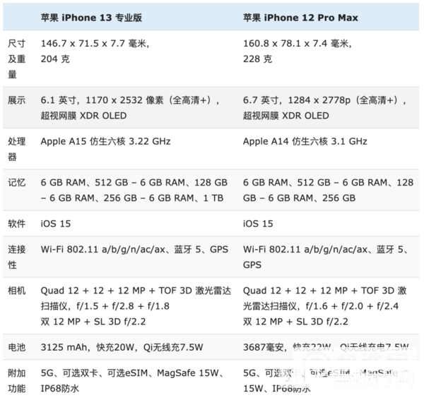 看完详细的参数对比图以及主要五个方面的对比,相信大家对于两款苹果手机的优缺点已经有了清晰的认识。相比之下,iPhone 13 Pro 的优势在于更小的屏幕缺口、更好的芯片组、更先进的摄像头、更紧凑的机身以及万众期待的120Hz 刷新率。
