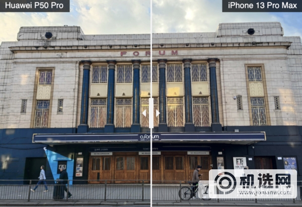 使用更广角的主镜头拍摄的照片,两张照片中建筑物的颜色非常相似,而且虽然iPhone 13 Pro Max的照片看起来更明亮,但当你抬头仰望天空时,却有很大的差异。你可以在华为P50 Pro 图像中辨认出个别云彩,而iPhone 13 Pro Max 的左上角则变成了一大块明亮的斑点。
