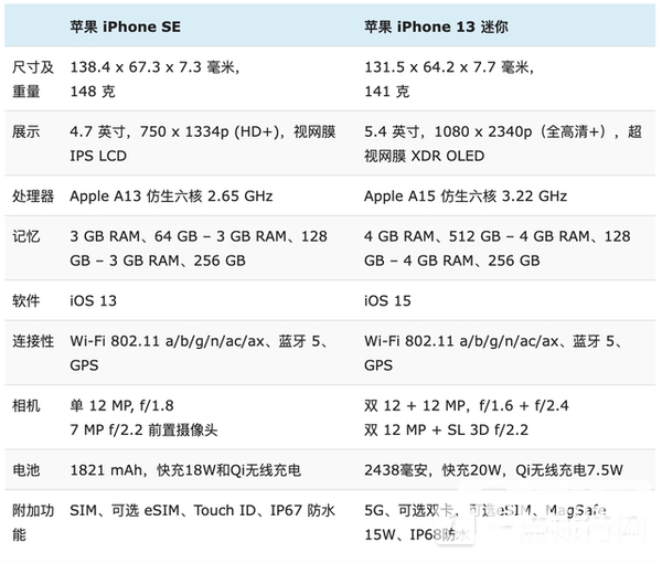 总的来说,iPhone 13 mini的优势在于主流的全面屏设计、更大的电池、先进的摄像头、开箱即用的iOS 15系统软件、超强的A15芯片以及防水性能。缺点是太贵了。虽然iPhone SE2各方面都不及iPhone 13 mini,但iPhone SE2的价格更具吸引力,而且Touch ID在需要口罩的环境下也是一大优势。