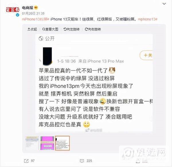 微博上,不少网友开始抱怨自己的iPhone 13粉屏。不仅是这个问题,还出现了不同程度的卡顿、自动重启、死机等问题。这不是苹果第一次发生汽车翻车的情况,也不是第一次屏幕出现问题。