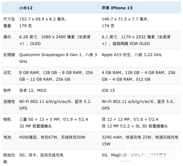 苹果iPhone 13搭载A15 Bionic芯片组,5nm工艺制造,最高主频3.22GHz;小米12搭载4nm骁龙8代1移动平台,最高主频3GHz。