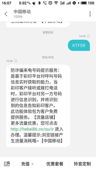 如果您是移动VoLTE用户,只需发送“ktfsr”或“自动拦截高频号码来电”至“10086”即可启用自动拦截高频号码来电。 (免费开通VoLTE需发送“VoLTE”至“10086”)