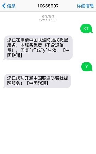 发送短信“KT”到“10655587”,联通会让我们确认,然后发送“Y”就完成了。