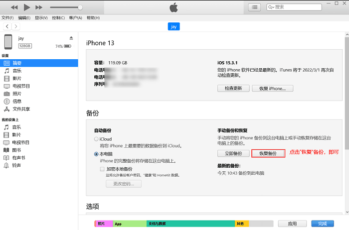 经常有备份习惯的朋友可以使用iTunes来恢复自己删除的短信。 iTunes备份不仅可以备份手机的数据,还可以备份短信通话记录等,因此,当我们的短信不小心被删除时,我们可以使用iTunes备份来恢复。当然,前提是我们需要对手机上的数据进行备份。另外需要注意的是,iTunes备份会覆盖手机原有的数据和设置。如果没有备份,如何恢复已删除的短信?您可以查看下面的第二种方法。
