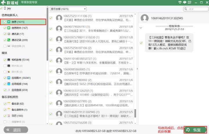 第三步:扫描完成后,我们需要点击左侧的“信息”找到我们已经删除的短信,然后选择我们想要恢复的短信,点击右下角的“恢复”按钮。