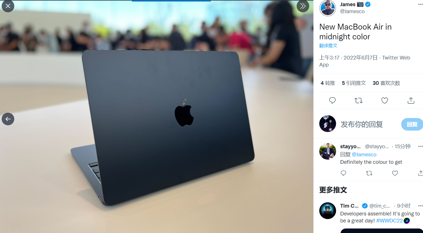 Air,除了银色和深空灰之外,这款笔记本现在还有两种新外观:午夜色和星光色。