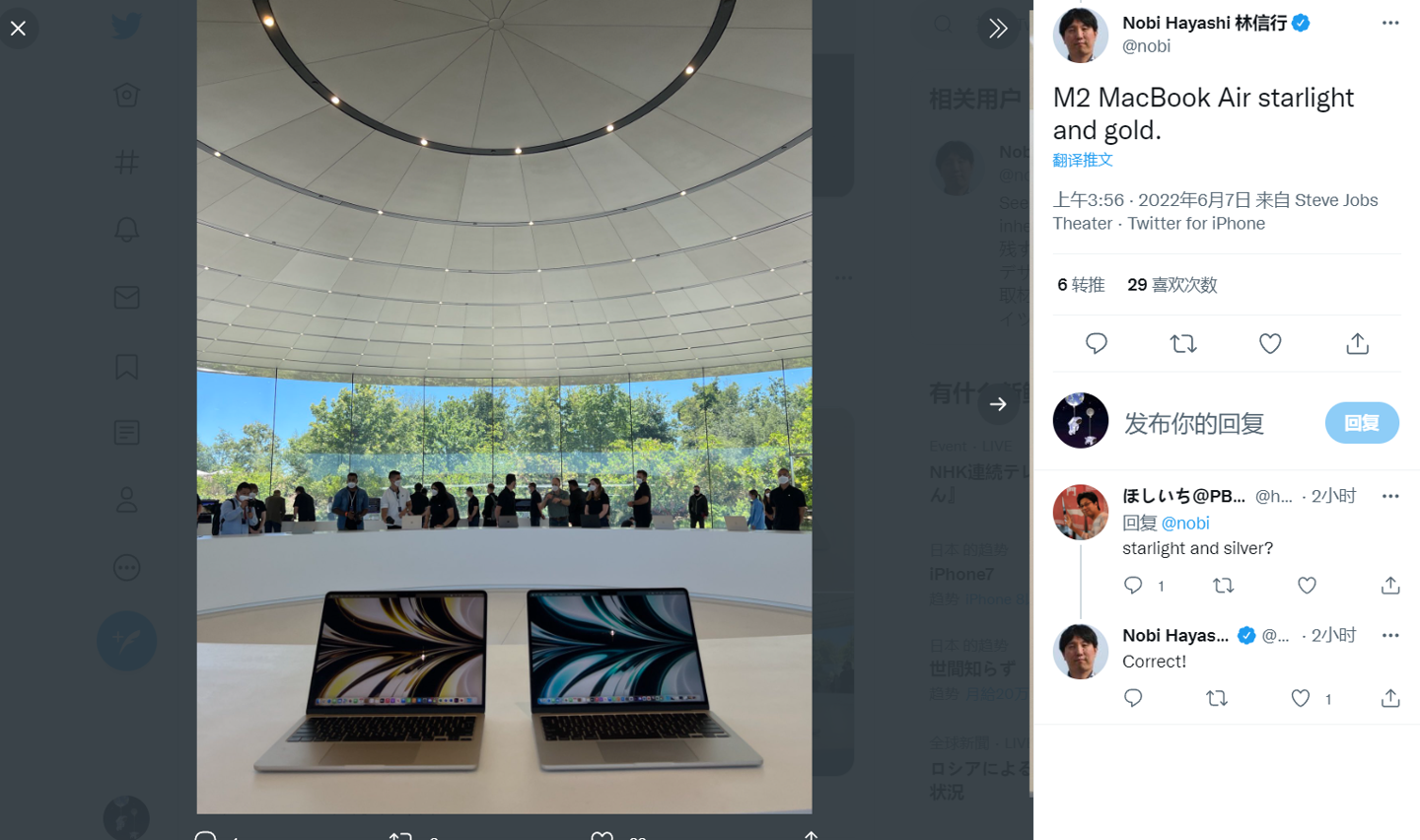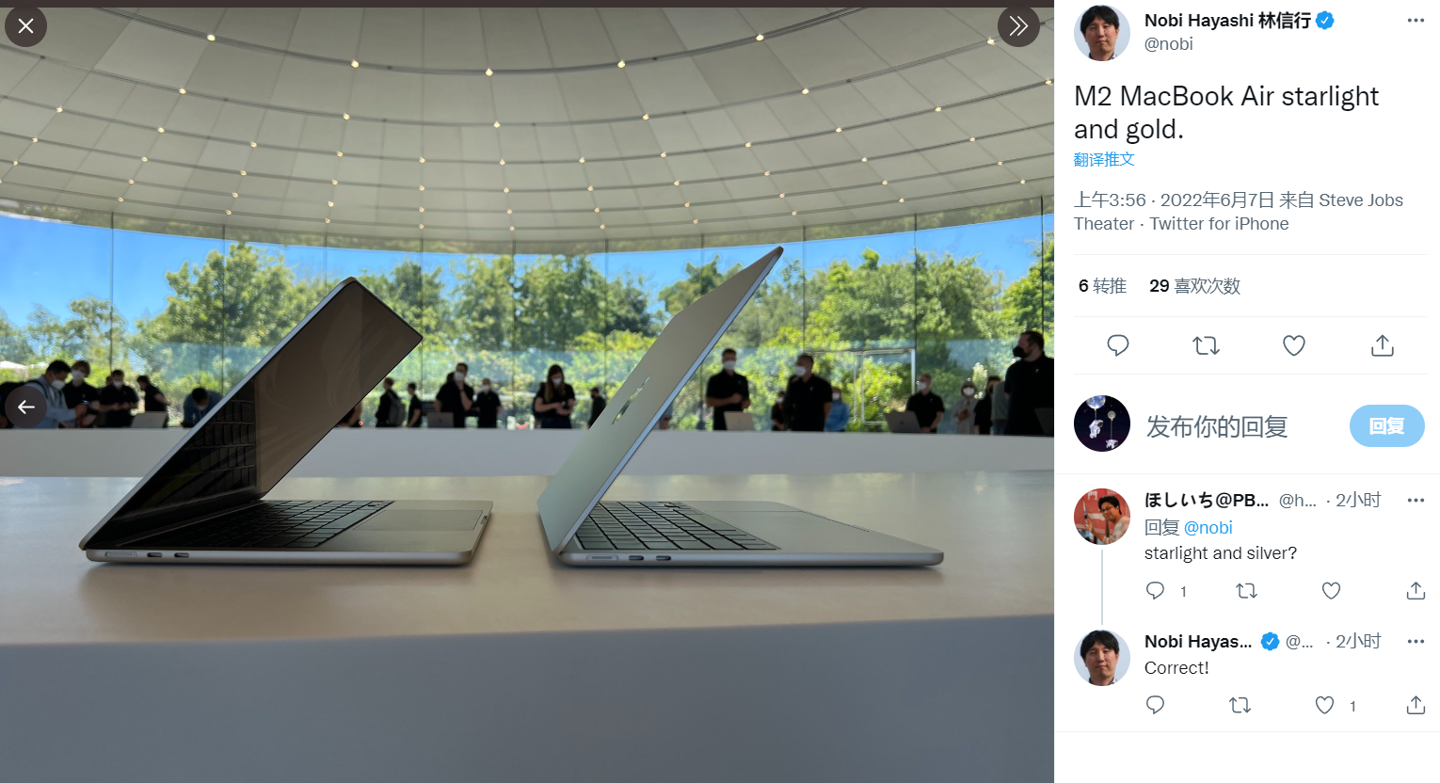 科技记者Nobi Hayashi发布了午夜色和星光色两种颜色组合的真机图片,后者看起来类似于香槟金。