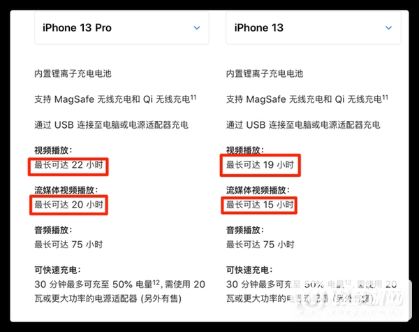 但事实并非如此。根据苹果官方数据,iPhone 13 Pro 在视频和流媒体播放时间方面优于iPhone 13。