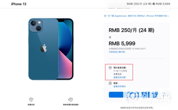 iPhone 13和iPhone 13 mini仍有库存,预计发货日期为7-10个工作日。
