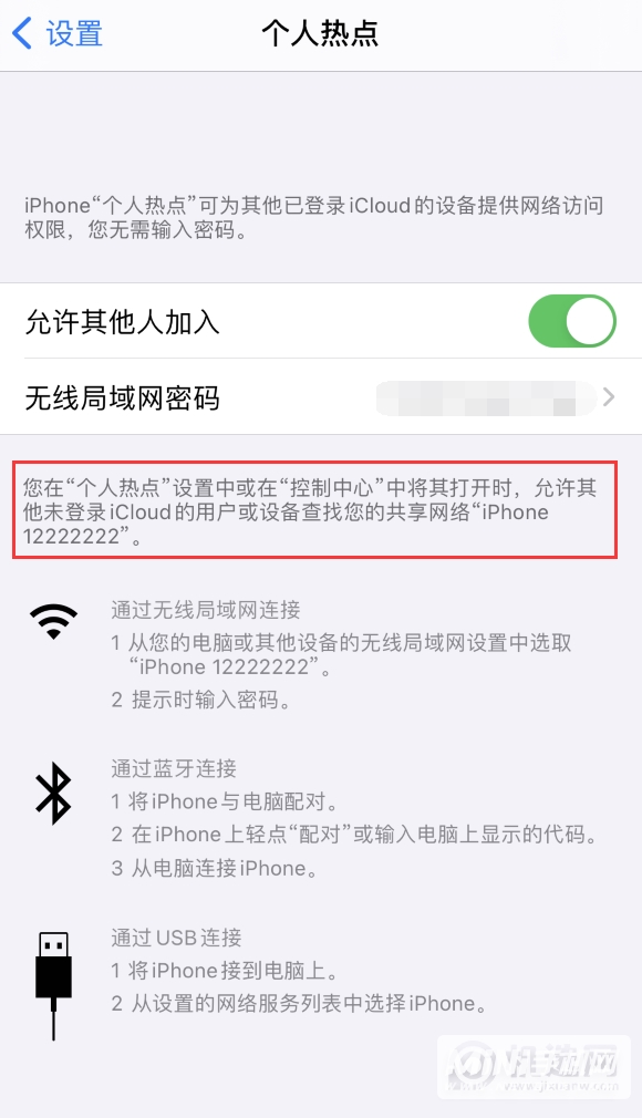 修改完成并保存后,打开iPhone设置-个人热点。当您打开“允许其他人加入”开关后,您可以在下方看到修改后的设备名称,即热点名称。