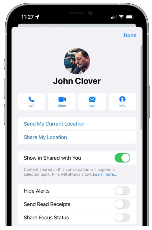 在iMessage 等消息应用程序中,用户可以点击联系人的姓名并选择是否与他们共享自己的状态。