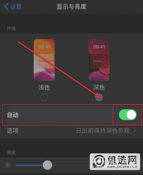 3、在显示和亮度界面找到【自动】,点击自动选项后面的按钮(绿色表示开启,灰色表示关闭);