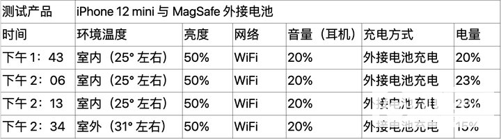 最近推出的MagSafe 外置电池也是如此。我们模拟了日常观看哔哩哔哩视频的场景,测试了使用MagSafe外置电池对iPhone 12 mini的充电体验。其他测试条件及结果如下: