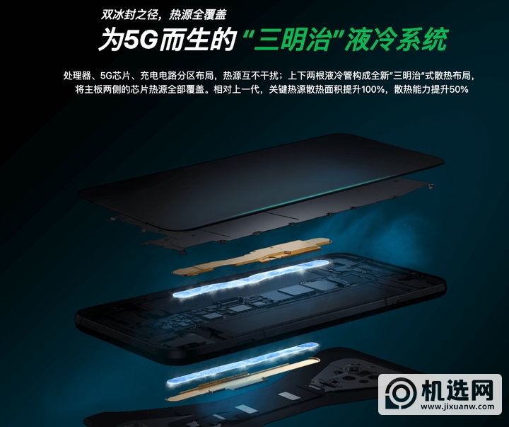 黑鲨称其为“三明治”液冷系统。它实际上在主板的前端和后端放置了一根金属热管。一般来说,热管中会有大量的毛细管结构和相应的冷凝介质(处理过的水)和管道。内部将保持真空。