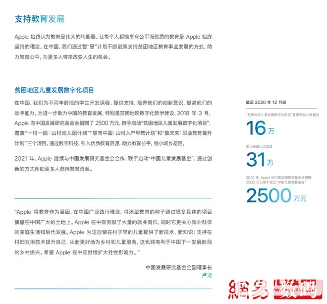 2018年3月,苹果向中国发展研究基金会捐赠2500万元,共同启动“贫困地区儿童数字化发展项目”。截至2020年12月底,该项目累计受益人数超过31万人。 2021年,苹果将继续与中国发展研究基金会合作,共同发起“中国儿童发展基金”,通过创新方式帮助更多人获得教育资源。