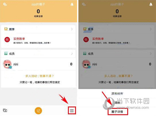 1.进入圈子账本应用后,点击【左下角图标】,点击想要退出的【圈子】。 (如下所示)