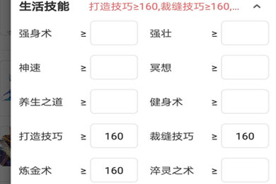 3、最后在设置过滤条件时选择“生活技能”选项,将炼金、制作技能、炼金技能设置为160,即可搜索符合条件的制作账号。