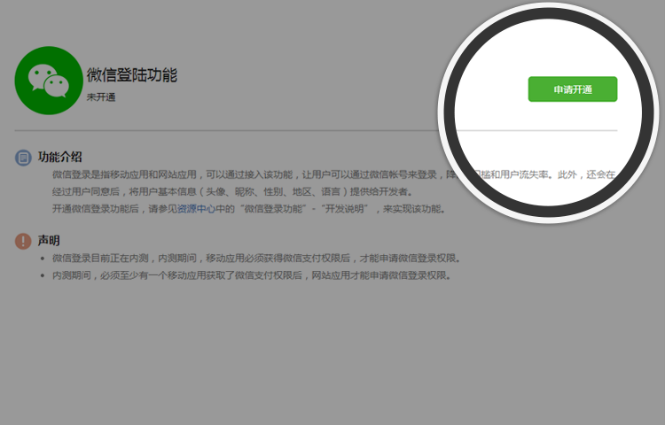 2.内测时,至少要有一个移动应用获得微信支付权限,网站应用才能申请微信登录权限。
