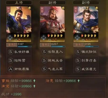 总结:这支队伍的满宠和徐晃属于同一体系,实力不属于夏侯惇的满宠玩法。至于曹操,有些玩家可能没有抽到,所以也可以考虑用郭淮作为替补,这样可以给满宠带来暂时的提振。躲避刮骨,郭淮带陷阱营地和鬼车或者其他输出战术。团队整体输出伤害足够了!最重要的是,这三个武将都比较好画!