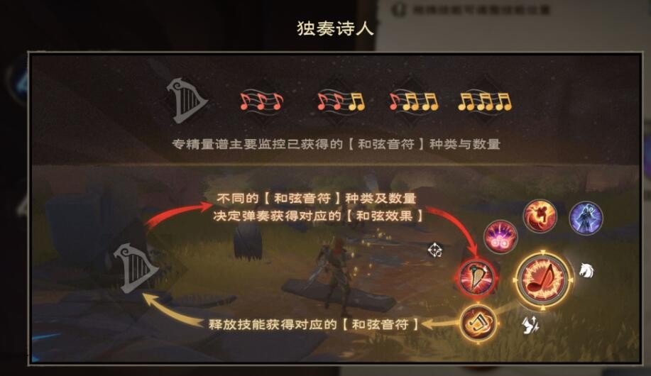 吟游诗人可以通过位置一技能和位置二技能进行独奏,然后可以分别补充绿色或黄色音符,然后使用“绿绿绿”,“黄黄黄”,“黄黄绿”等不同的音符组合,释放独特的合奏技能。各种组合的效果是完全不同的。玩家需要根据战斗中全局的变化来决定释放哪些合奏技能。