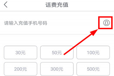 2、然后用户将进入手机充值界面。选择并点击右侧头像图案即可导入充值的电话号码。