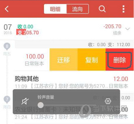 2.我们可以查看所有的消费记录,找出错误的账单。按住3 秒钟。将出现“迁移”、“复制”和“删除”。点击删除,如下图所示。