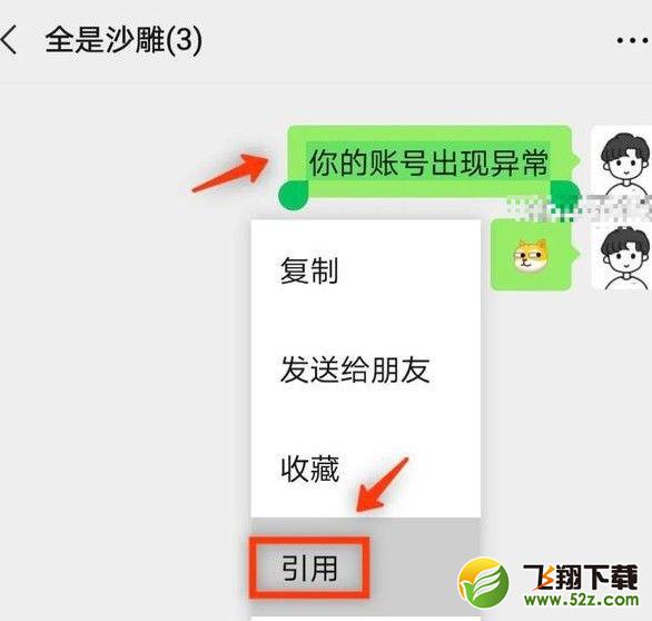 修改后,返回群聊,发送一些恶搞内容,比如“你的账号出现异常”、“对方是你爸爸,说话小心点”等,然后长按聊天消息您刚刚发送并点击“报价”。
