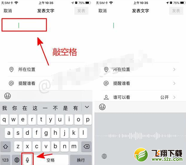 如果你用的是iPhone,我们也是先进入文字朋友圈的编辑界面,输入几个空格,然后点击输入法中的【麦克风】图标,让它被识别。