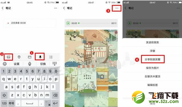 步骤:【收藏】-【新建笔记】-【添加语音】-【添加图片】-【更多】-【分享精彩瞬间】