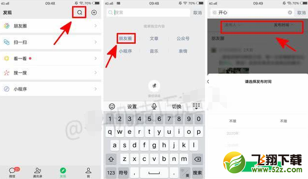 步骤:【搜索】-【朋友圈】-【输入关键词】-【可选发布人员及发布时间】