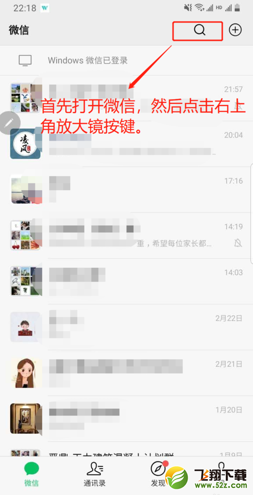 1.首先打开微信,然后点击右上角的放大镜图标。