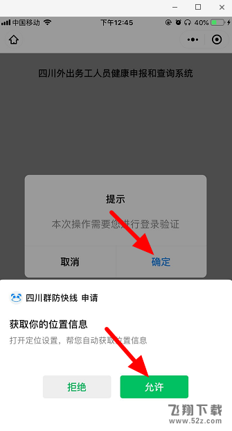 点击“允许”获取位置信息,在弹出的登录验证提示框中点击“确定”。