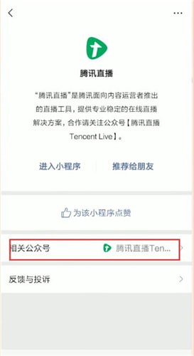 3、选择关于腾讯直播,点击相关公众号;